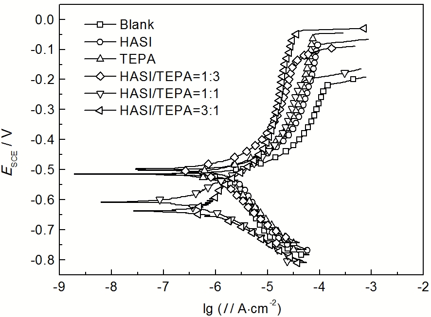 有许多方法可用来减缓或防止混凝土中钢筋的腐蚀。其中,在混凝土浇筑时添加缓蚀剂是控制钢筋腐蚀的一种经济而有效的措施[5]。然而,由于混凝土的高碱性,钢筋表面通常被一层氧化膜所覆盖,与常规裸露金属的腐蚀防护相比,其过程十分复杂,受多种因素的交互影响。因此,使用单一的缓蚀剂往往很难达到有效抑制钢筋腐蚀的目的,若利用不同缓蚀成分间的协同效应,通过适当的复配,不仅可大幅提高缓蚀剂的缓蚀效果,而且可有效降低防护成本,已成为混凝土钢筋缓蚀剂研究的重点。Criado等[6]分别研究了β-甘油磷酸钠与3-氨基苯甲酸钠或N-苯基邻氨基苯甲酸钠复配物,在碳化混凝土中对钢筋的缓蚀性能,结果表明β-甘油磷酸钠与N-苯基邻氨基苯甲酸钠复配后缓蚀性能明显提高,二者间具有很好的缓蚀协同效应。杨榕杰等[7]在混凝土模拟液中研究了D-葡萄糖酸钠、钼酸盐、硫脲复配物对钢筋的缓蚀作用,结果表明三组分间具有良好的协同效应。本课题组前期研究[8,9]表明,硬植酸咪唑啉 (HASI) 化合物分子中富电子咪唑环基团通过与Fe原子间的化学键合,可有效吸附在钢筋表面并形成牢固的吸附保护膜,进而有效抑制溶液中Cl-对钢筋的侵蚀破坏。而添加有机胺,可大幅提高钢筋的点蚀电位,有效抑制混凝土模拟液中钢筋的点蚀[10,11]。为此,本文将HASI与四乙烯五胺(TEPA)进行复配,利用线性极化、动电位极化和电化学阻抗技术,在含3.5%NaCl的混凝土模拟液中对复配缓蚀剂的缓蚀性能进行研究,并借助分子动力学模拟对二者间的缓蚀协同机理进行了探讨。