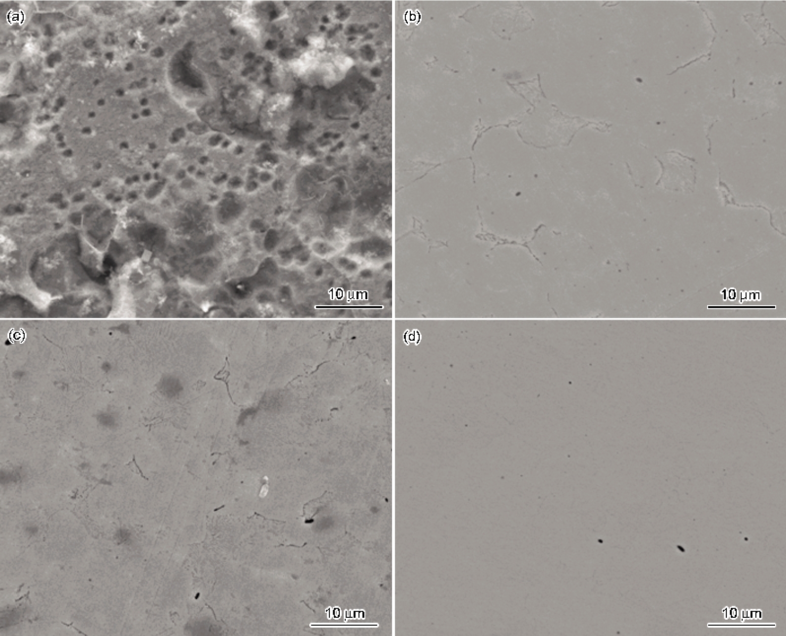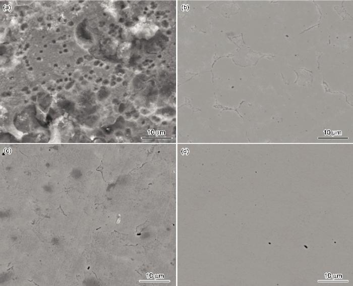 Fig.4 SEM images for the steel rebar samples after 28 d immersion in 3.5%NaCl saturated Ca(OH)2 solutions containing 0 mmol/L (a) and 0.2 mmol/L HASI (b), TEPA (c) or HASI/TEPA=3∶1 (mole ratio) (d)