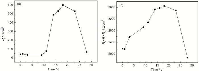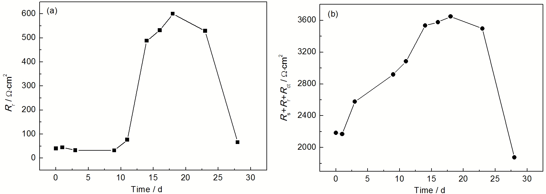 Fig.3 Changes of Rr (a) and (Rs+Rr+Rct) (b) with immersion time for X80 pipeline steel in coastal tidal flats simulated soil solution