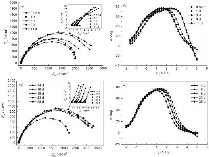 Fig.1 Nyquist (a, c) and Bode (b, d) plots of X80 pipeline steel immersed in coastal tidal flats simulated soil solution for 0.02~11 d (a, b) and 14~28 d (c, d)