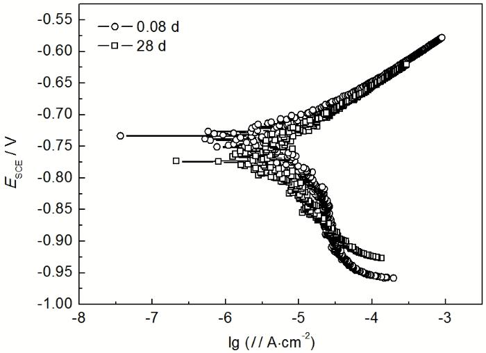 EIS和动电位极化曲线均采用PARSTAT 2273电化学测量系统。EIS测试采用三电极体系,以X80管线钢为工作电极,Pt电极为辅助电极,饱和甘汞电极 (SCE) 为参比电极,工作电极和参比电极之间采用盐桥连接。测试在X80管线钢的开路电位 (OCP) 下进行,正弦波电位幅值为10 mV,频率扫描范围为100 kHz~10 mHz,采用ZSimpWin软件对测试数据进行数值拟合,解析等效电路的结构和各元件的参数。动电位极化曲线测试扫描速率为0.50 mV/s,扫描范围为±250 mV (vs OCP),分析软件为Powersuite。