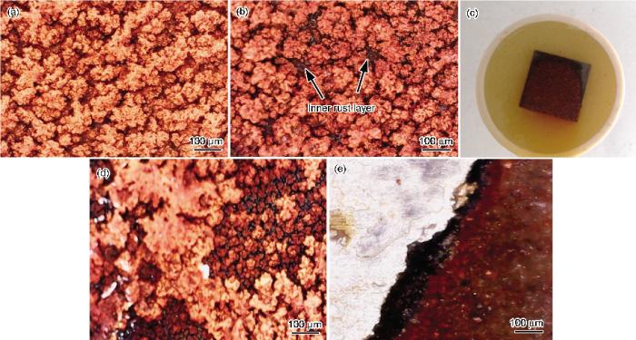 Fig.5 Surface corrosion micrographs (a, b, d, e) and macrograph (c) of X80 pipeline steel in coastal tidal flats simulated soil solution for 11 d (a), 14 d (b), 16 d (c) and 28 d (d, e)