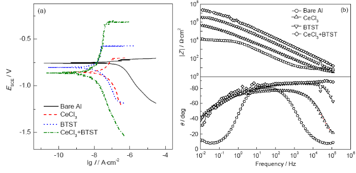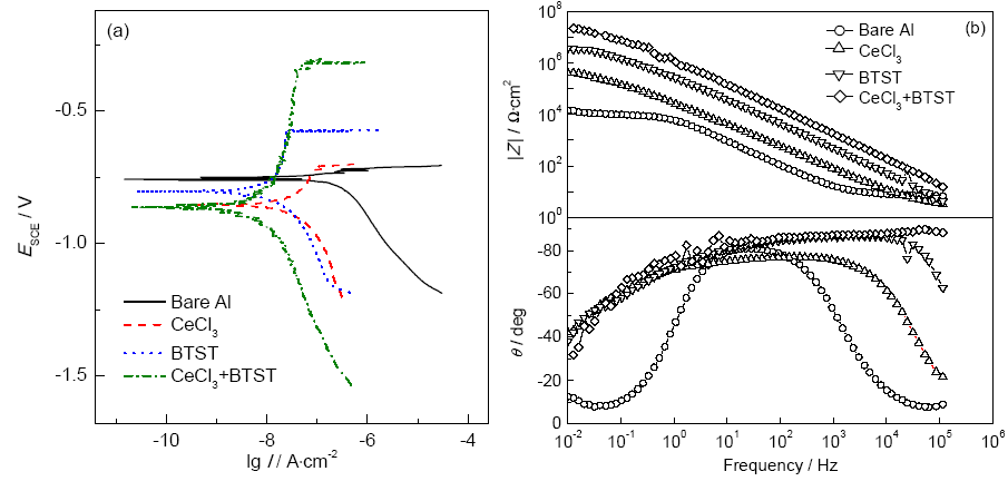 Fig.2 Polarization curves (a) and EIS plots (b) of Al alloy electrode with different conversion films in 3%NaCl solution at the early immersion stage