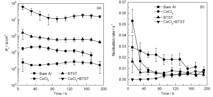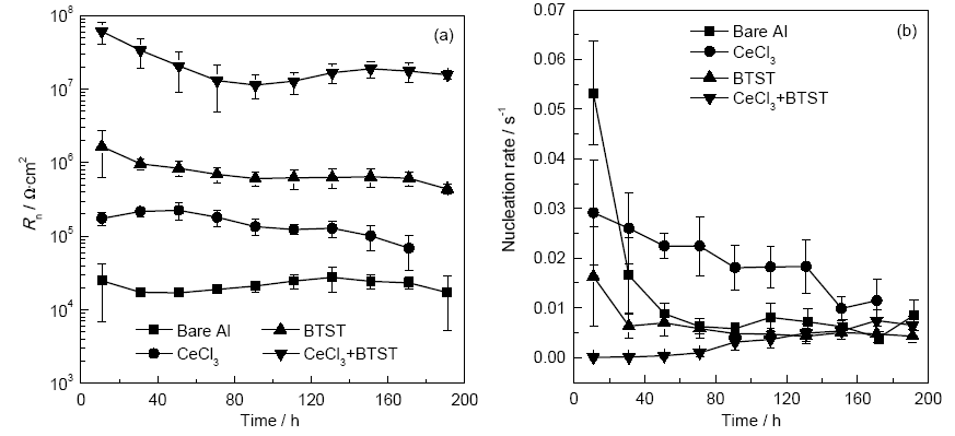 Fig.4 Evolutions of noise resistance (a) and nucleation rate (b) for Al alloy electrode with different conversion films in 3%NaCl solution