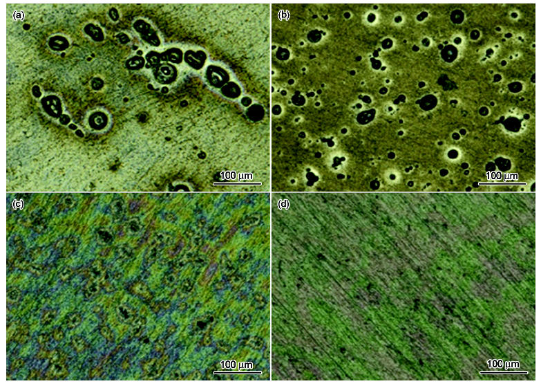 Fig.7 Corrosion morphologies of Al alloy samples without (a) and with siloxane then cerium salt complex film (b), siloxane/cerium salt co-deposition film (c) and cerium salt then siloxane complex film (d) after immersed in 3%NaCl solution for 312 h