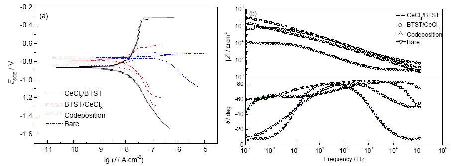(2) 铈盐与硅氧烷的沉积顺序对复合转化膜的耐蚀性有很大影响。先铈盐后硅氧烷的顺序沉积工艺,能增强复合转化膜的物理隔绝性和疏水性,降低了膜层的导电性和电解液的渗透性,其防护能力强于先硅氧烷后铈盐的顺序沉积工艺。