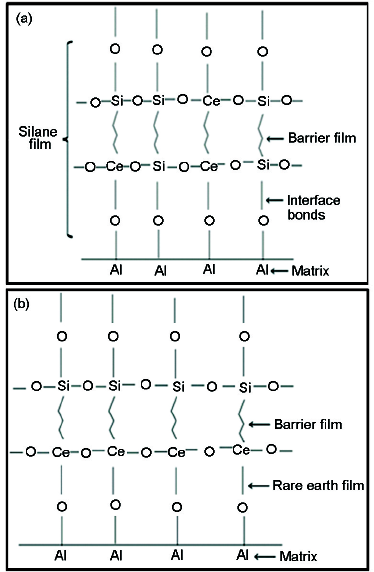 Fig.8 Schematic diagrams of cerium salt/siloxane complex film through the process of co-deposition (a) and step-by-step deposition of cerium salt and siloxane (b)