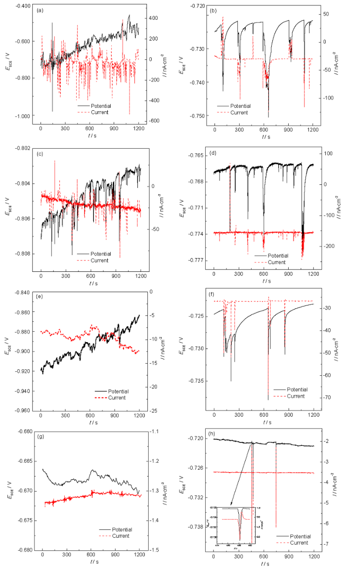 Fig.3 ECN of Al alloy (a, b), cerium conversion film (c, d), and cerium /siloxane complex film (e, f) after immersion in 3%NaCl solution for 1 h (a, c, e, g) and 168 h (b, d, f, h)