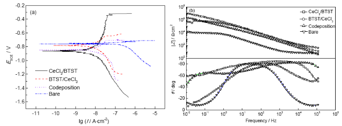3.2.1 电化学测试 为了评价铈盐/BTST硅氧烷顺序沉积法制备的复合转化膜以及单独的铈盐或BTST转化膜的防护性能,对比了这几种转化膜电极在3%NaCl溶液中浸泡初期 (约为0.5 h) 时的极化曲线和EIS谱,见图2。