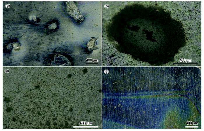 Fig.5 Corrosion morphologies of Al alloy samples without (a) and with cerium salt (b), siloxane (c) and cerium salt/siloxane complex (d) conversion films after immersed in 3%NaCl solution for 168 h