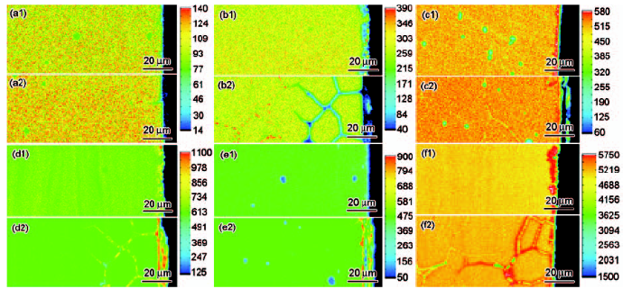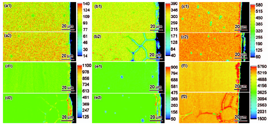 Fig.4 EPMA elements distribution mappings of Cr (a, b), Ni (c, d) and Fe (e, f) elements on the cross-sections of Hastelloy N (a, c, e) and 316L (b, d, f) exposed for 50 h (a1~f1) and 1000 h (a2~f2)