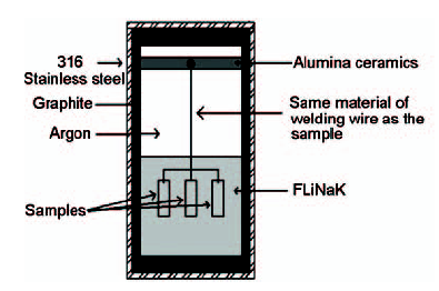 分别用同种材质的焊丝固定Hastelloy N合金和316L不锈钢试样。为保证腐蚀实验结果的准确性,每组实验选取3个平行试样,将试样垂直悬挂于石墨坩埚中,具体见图1。分别将Hastelloy N合金和316L不锈钢试样放入不同坩埚中,并在每个坩埚中加入600 g FLiNaK盐。