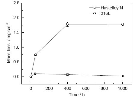 The corrosion behavior of Hastelloy N and 316L stainless steel (316L) in molten eutectic LiF-KF-NaF (FLiNaK) salt at 700 ℃ for 1000 h was investigated by means of static corrosion tests, while the corroded alloys were examined by SEM and EPMA. It was found that Hastelloy N and 316L all suffered from steady corrosion, while the corrosion resistance of Hastelloy N was superior to that of 316L. Hastelloy N experienced slight uniform corrosion, which was mainly due to the outward diffusion of Cr from the alloy. While 316L suffered from significant intergranular corrosion, which was related to the outward diffusion of Cr along grain boundaries. In addition, the mass loss of Hastelloy N firstly increased, and then degraded slowly with exposure time, which was mainly attributed to the re-deposition of Ni and Fe from the molten salt on the surface of Hastelloy N. The mass loss of 316L increased obviously for the first 400 h, and then became stable. The different in corrosion behavior of the two alloys in molten fluoride salt was mainly associated with their difference in chemical composition.