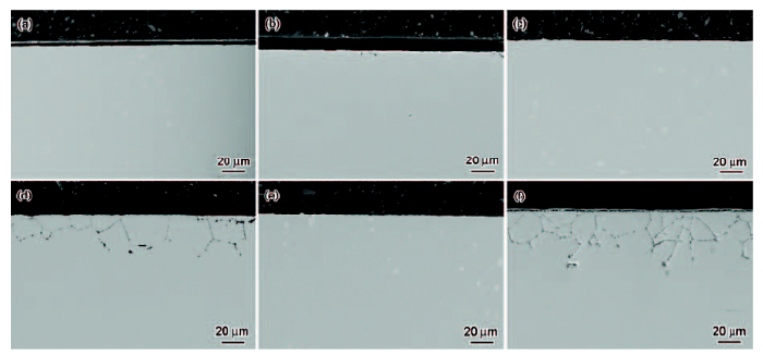 Fig.3 Cross-section SEM images of Hastelloy N (a, c, e) and 316L (b, d, f) exposed for 50 h (a, b), 400 h (c, d) and 1000 h (e, f) in molten FLiNaK at 700 ℃