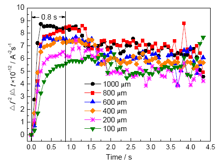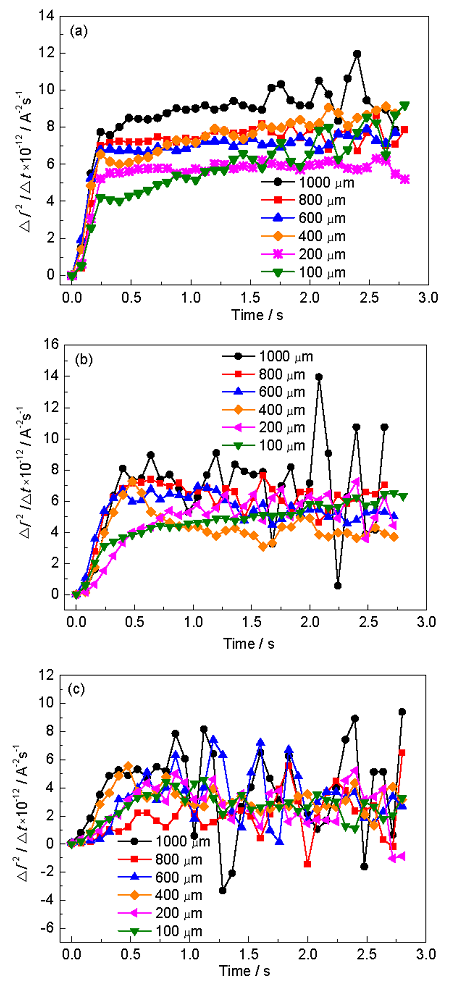 图4 无外加电场作用下的Pt电极在不同厚度的0.35%NaCl薄液膜下的Δ{1/[iF(t )]2}/Δt对时间曲线