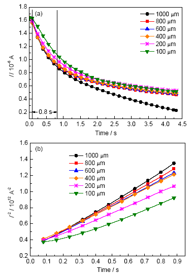 图2为Pt电极在无外加电场时不同厚度薄液膜下的阴极极化曲线。曲线可以分为3个部分:I为开路电位附近的线性极化区;II为受极限扩散控制的氧还原区;III为析氢反应区[30,32]。从图中可以看出,随着薄液膜厚度的减薄,区域II的溶解氧还原反应电流值增大,表明阴极还原反应速率是由氧扩散到Pt电极表面的过程所控制[33-35]。结合极化曲线测量,这里将计时电流法的阶跃电位设为从发生非Faraday过程的+300 mV阶跃至由O2传输到电极表面的扩散为单一机制的-690 mV[17,36,37],使得由计时电流法测得的电流与时间的关系满足Cottrell方程[38]:
