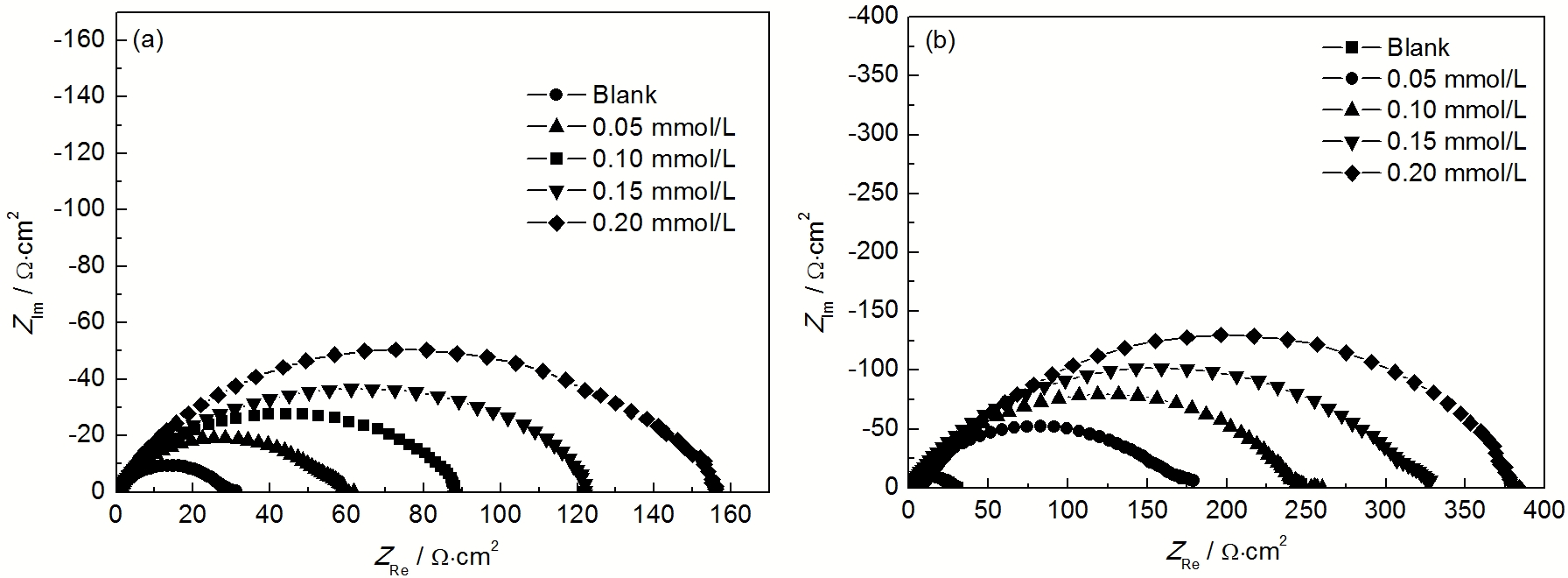 Fig.3 Nyquist plots of N80 steel in 15%HCl solutions without and with various concentrations of PAB (a) and PPB (b)