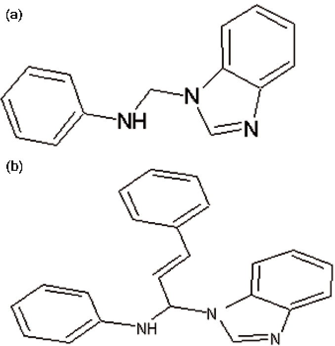 参照文献[15]的方法,将苯并咪唑、苯胺、37%甲醛溶液 (或肉桂醛) 依次加至甲苯中,60 ℃搅拌1 h,然后回流分水3 h,静置冷却,析出白色或黄色固体,用乙醇∶丙酮为2∶3的混合溶剂重结晶。采用Fourier变换红外光谱仪测定PAB和PPB的红外光谱(IR,Nicolet6700,溶液法)。PAB和PPB的分子结构见图1。