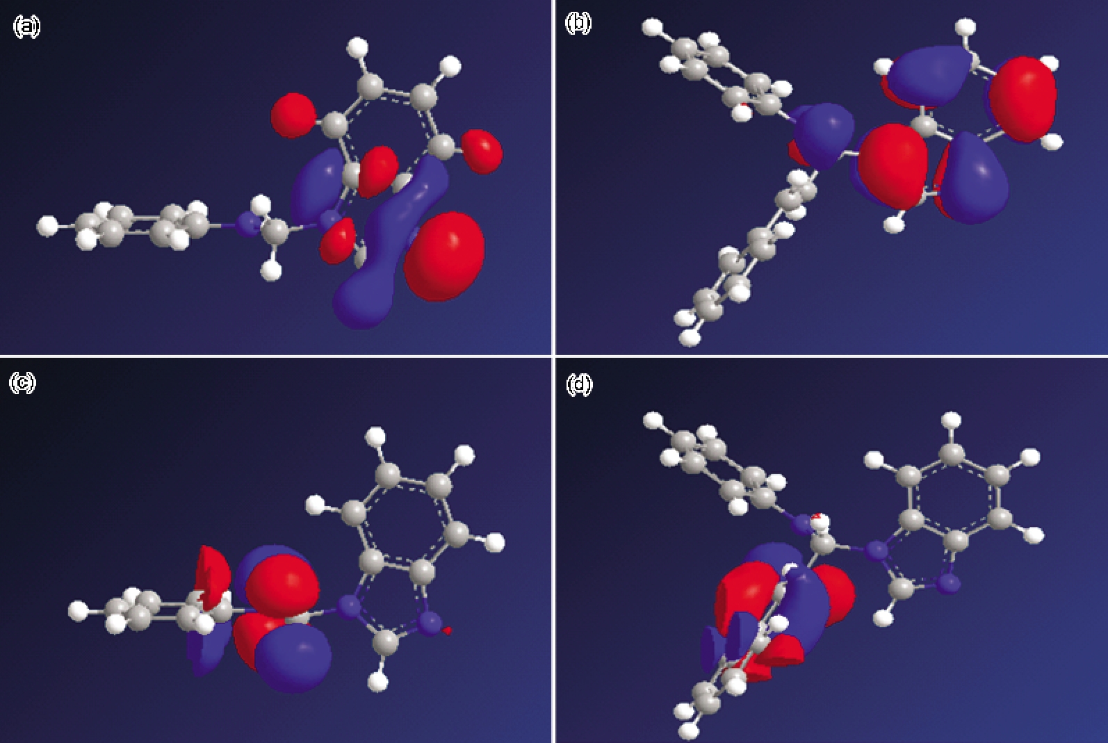 Fig.6 HOMO (a, b) and LUMO (c, d) of PAB (a, c) and PPB (b, d) moleculars