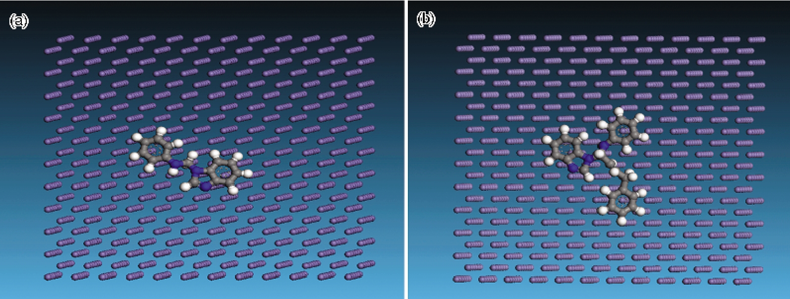 选取晶体Fe (001) 晶面为吸附表面,表面体系厚度为6层共计792个Fe原子。模拟中使用Materials Studio 5.0 软件包中COMPASS力场对体系进行优化,正则系综 (NVT) 的分子动力学 (MD) 模拟通过Discover模块完成。模拟温度为30 ℃,采用Andersen恒温器进行温度控制。Van der Waals和库仑相互作用采用 Charge-Group方法计算。