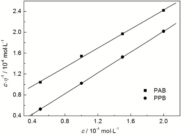 式中,cinh为缓蚀剂浓度,η为缓蚀率,Kads为平衡吸附常数。以Cinh/η对Cinh作图,得到了图5所示的吸附等温线。线性拟合的复相关系数均大于0.99,表明用Langmuir吸附等温式来关联PAB和PPB的浓度与缓蚀率是合理的。根据所拟合直线方程的截距可以求出吸附平衡常数 (Kads),再由下式可计算出吸附作用的Gibbs自由能 (ΔGθads):