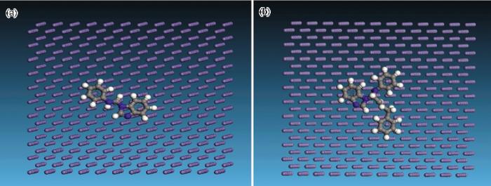 Fig.7 Equilibrium adsorption configurations of inhibitors PAB (a) and PPB (b) on Fe (001) planes
