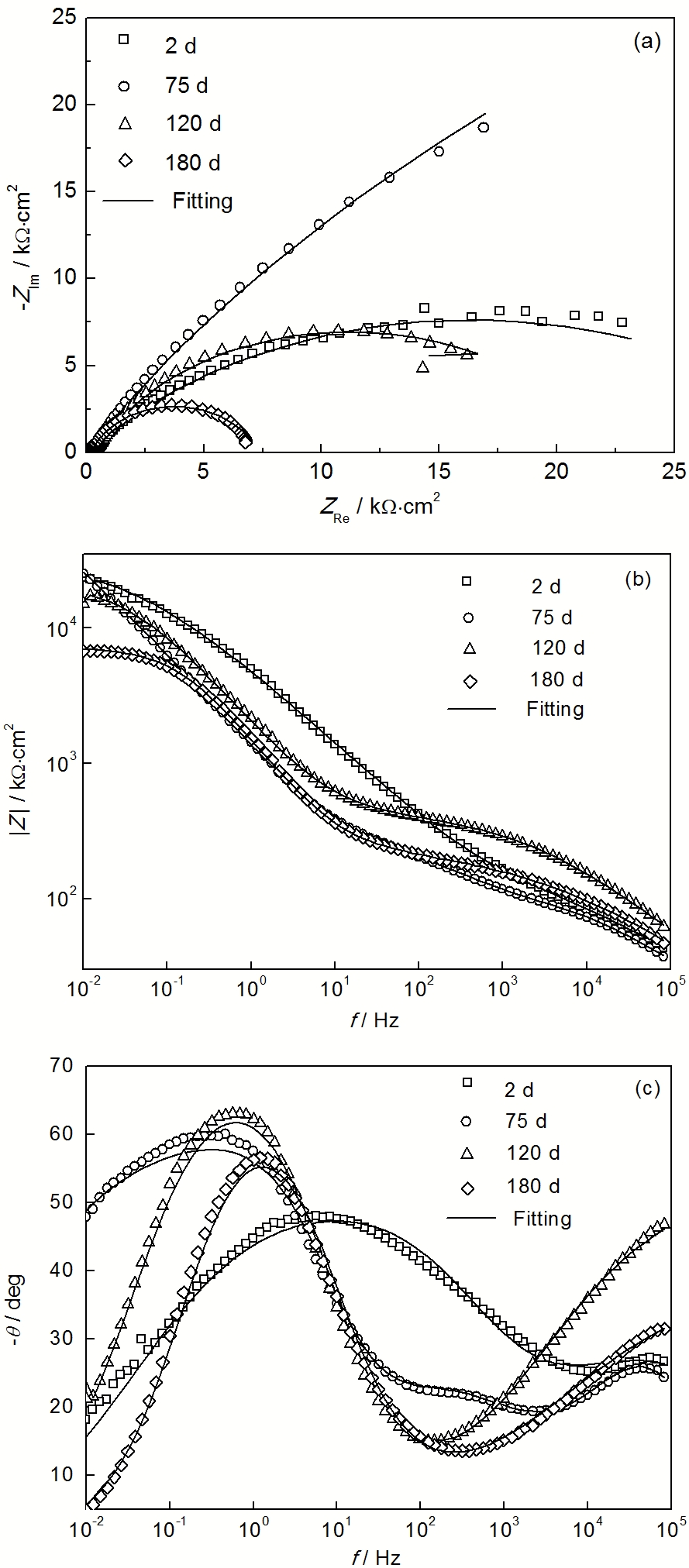 Fig.6 Fitting results of Nyquist (a) and Bode (b, c) plots for Al-Zn-Si-RE coatings immersed for different time