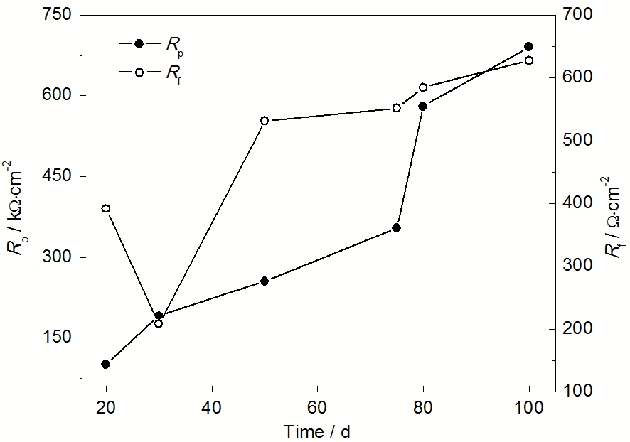 图7给出浸泡第二阶段涂层中Rf和Rp随浸泡时间的变化情况,在该阶段,Rp和Rf均随浸泡时间的延长而呈不断增长趋势。Rp和Rf增加的原因是腐蚀产物在金属粉表面覆盖引起的[26]。在该阶段Rp的值很高,说明涂层中金属粉的消耗速率很低,从而延长了涂层的有效保护时间。
