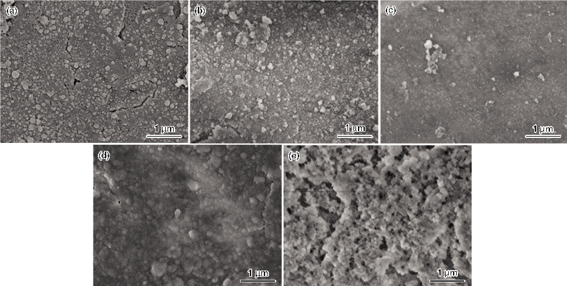 由图9a可见,浸泡30 d后,涂层发生轻微腐蚀,金属粉表面有细小均匀分布的球状颗粒析出,随着浸泡时间的延长,生成的腐蚀产物颗粒不断沉积在涂层表面和缺陷处,浸泡75 d后涂层金属粉形态消失 (图9b),出现所谓的“自修复作用”。当涂层浸泡100 d后,涂层表面已经形成一层薄薄的连续均匀的腐蚀产物膜,高倍下观察腐蚀产物极其细小 (图9c);随腐蚀介质的不断渗透,涂层表面下方的金属粉也发生腐蚀,腐蚀产物层不断积累变厚,随着浸泡时间的继续延长,腐蚀产物膜内的纳米尺寸的腐蚀产物晶粒逐渐团聚长大,在浸泡120 d后,腐蚀产物膜呈现以团聚态存在的纳米微观组织 (图9d)。涂层经过180 d的浸泡后,在腐蚀介质的继续作用下,腐蚀产物不断增多,体积膨胀作用使得涂层表面有微裂纹出现 (图9e),但是腐蚀产物仍比较致密,可以起到一定的屏蔽作用。