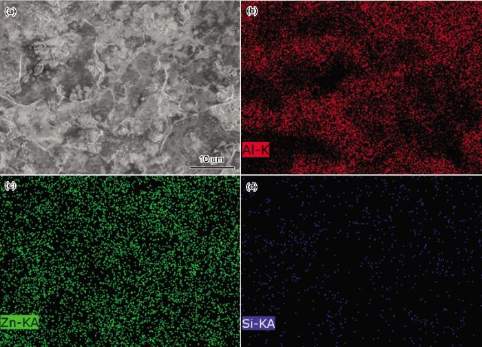 Fig.2 SEM image (a) of Al-Zn-Si-RE coating and distribution maps of Al (b), Zn (c) and Si (d)