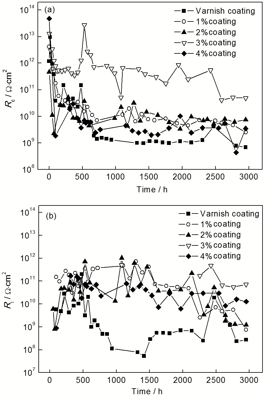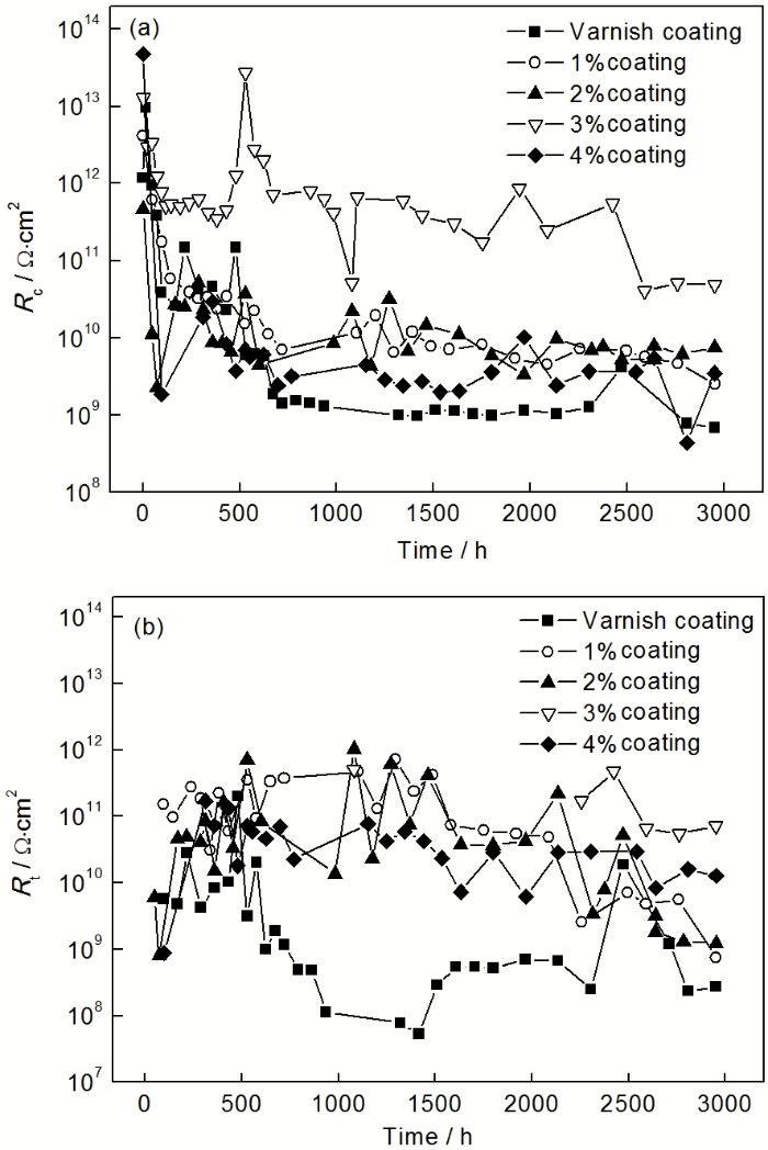 图4a是不同涂层试样在3.5%NaCl溶液中的Rc随浸泡时间的变化。Rc越大表明涂层的致密性越高,涂层的屏蔽性越好。可以看出,在2952 h的浸泡过程中,几种涂层试样的Rc均随浸泡时间的延长逐渐下降,3%涂层试样的Rc除了浸泡初期之外一直保持最高。在浸泡2952 h后,3%涂层试样的Rc为4.89×1010 Ωcm2,而清漆,1%,2%和4%涂层试样的Rc分别为6.86×108,2.54×109,7.50×109和3.49×109 Ωcm2,与3%涂层试样相比至少下降了一个数量级。