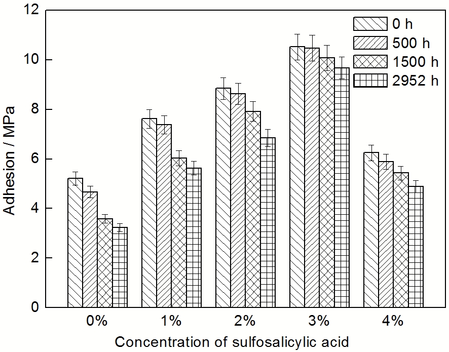 由以上的实验结果可以看出,添加3%磺基水杨酸可以得到最大的涂层附着力,同时,磺基水杨酸对镀锌钢具有缓蚀性能,这使得添加3%磺基水杨酸的涂层具有最佳的防腐蚀性能。