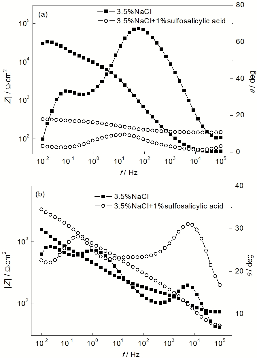 为了研究磺基水杨酸对镀锌钢基体腐蚀的影响,进行了镀锌钢在3.5%NaCl溶液和3.5%NaCl+1%磺基水杨酸溶液中的EIS测试,其测试结果见图6和表2。