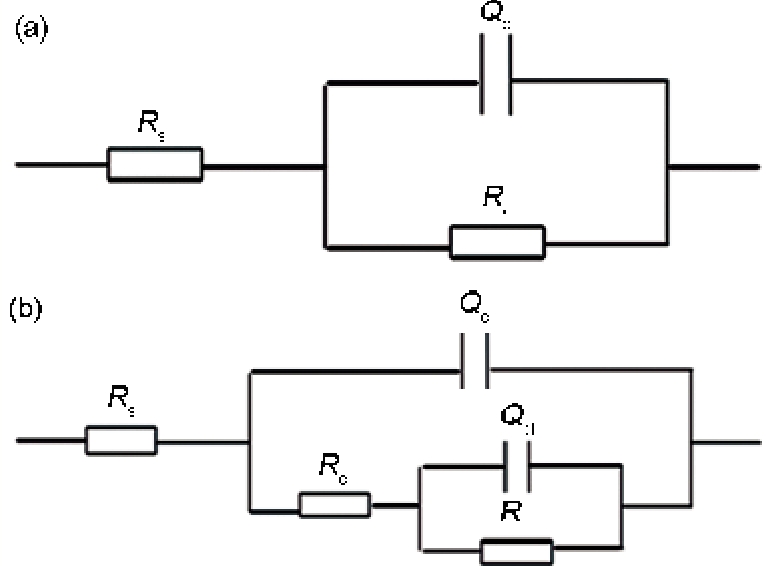 Fig.3 Equivalent circuits for fitting the experimental EIS date: (a) initial stage of the immersion, (b) middle stage of the immersion