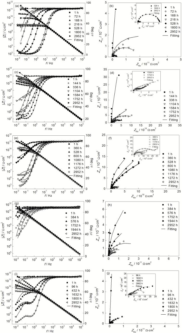 Fig.1 Bode (a, c, e, g, i) and Nyquist (b, d, f, h, j) plots of samples with varnish (a, b), 1% (c, d), 2% (e, f), 3% (g, h) and 4% (i, j) coatings in 3.5%NaCl solution