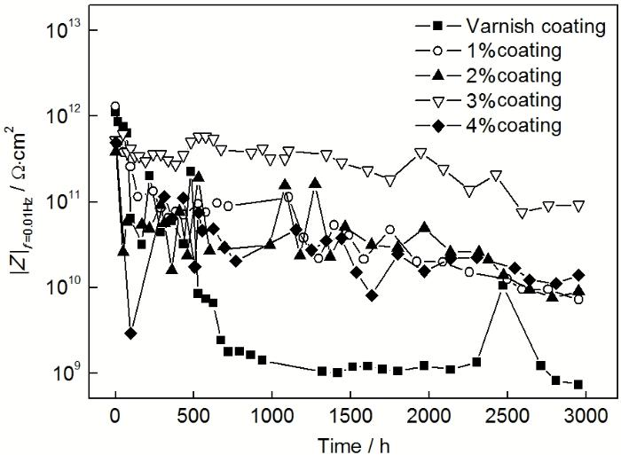 图2 不同涂层试样在3.5%NaCl 溶液中的低频阻抗模值|Z|f=0.01 Hz随浸泡时间的变化