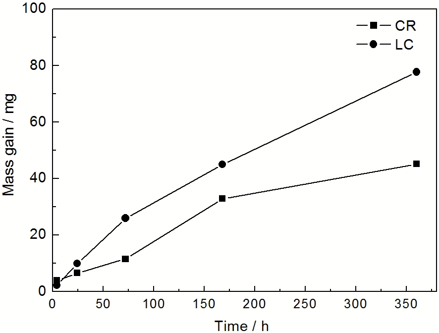 Fig.4 Mass gains of two steels after salt-spray corrosion test