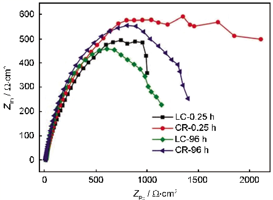 电化学阻抗谱同样可以反映腐蚀敏感性的大小。图3为两种钢在3.5%NaCl中性水溶液中浸泡0.25和96 h后测得的Nyquist阻抗谱。由图中可以看到,随着浸泡时间的延长两种钢的阻抗弧度均有缩小,但无论是短周期还是长周期浸泡后,CR钢的阻抗弧度均明显大于LC钢的。采用R(QR) 等效电路对图谱进行拟合后,得到CR钢在溶液中浸泡0.25和96 h后的极化电阻Rt分别为1912和1449 Ω/cm2,LC钢的Rt分别为1515和1252 Ω/ cm2,与阻抗弧变化趋势一致,CR钢的Rt均大于LC钢的。