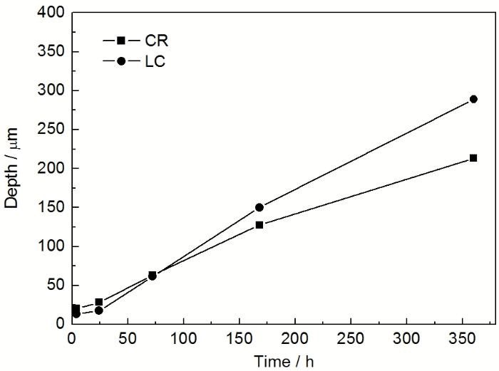 因此,极化曲线和阻抗谱均验证了CR钢的腐蚀诱发敏感性要弱于LC钢,但随着浸泡时间的延长,两种钢的腐蚀诱发敏感性都在增加。