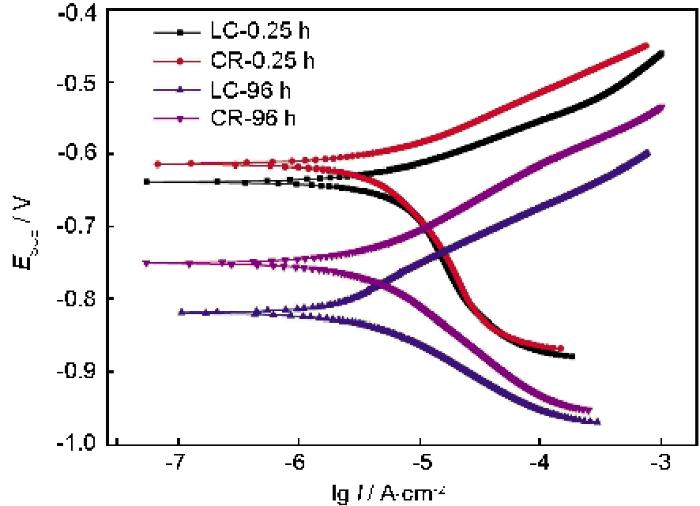图2为两种钢在3.5%NaCl中性水溶液中浸泡不同时间后测得的极化曲线。可见两种钢在溶液中浸泡0.25和96 h后,所测极化曲线均未出现钝化区间。自腐蚀电位和自腐蚀电流密度表征了该钢种对腐蚀敏感性的强弱。短时间浸泡后LC钢和CR钢的自腐蚀电位相差不大,分别为-640和-610 mV;自腐蚀电流密度相当,分别为6和5 μA/cm2。当浸泡96 h后,两种钢的自腐蚀电位均有明显下降,CR钢的自腐蚀电位下降至-750 mV,LC钢下降幅度更大,下降至-820 mV;而两种钢的自腐蚀电流密度变化不大,分别为4.0和4.5 μA/cm2。
