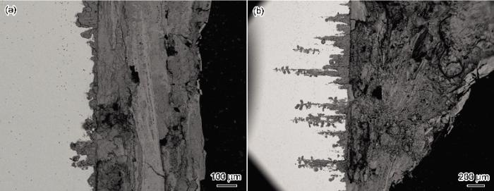 Fig.7 Cross section morphologies of corrosion layers formed on CR (a) and LC (b) steels after 168 h salt-spray corrosion test