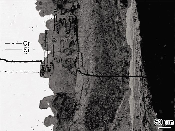 为了分析合金元素对形成致密锈层的影响机理,利用EPMA对CR钢锈层及基体剖面进行了半定量分析 (线扫),结果如图9所示。在图中可以看到内锈层存在明显的Cr和Si富集。松岛等[13]的研究认为,Cr提高钢在海水中耐蚀性的机理是其增强了锈层作为O2的扩散障壁的性质,降低了溶解氧扩散系数。同时,添加Cr和Al的耐蚀钢表面生成了富Cr和Al的黏附的硬的内锈层。而Yamashita等[14]的研究指出提高Cr含量有利于细化α-FeOOH,当锈层/金属界面的α-FeOOH中Cr含量超过5% (质量分数) 时,能有效抑制腐蚀性阴离子,特别是Cl-的侵入。