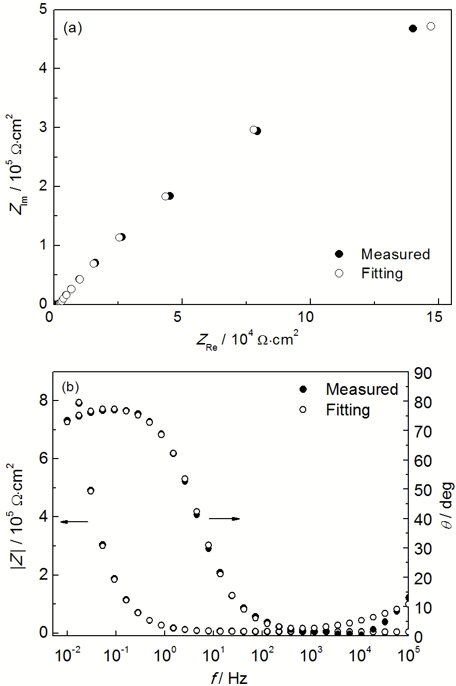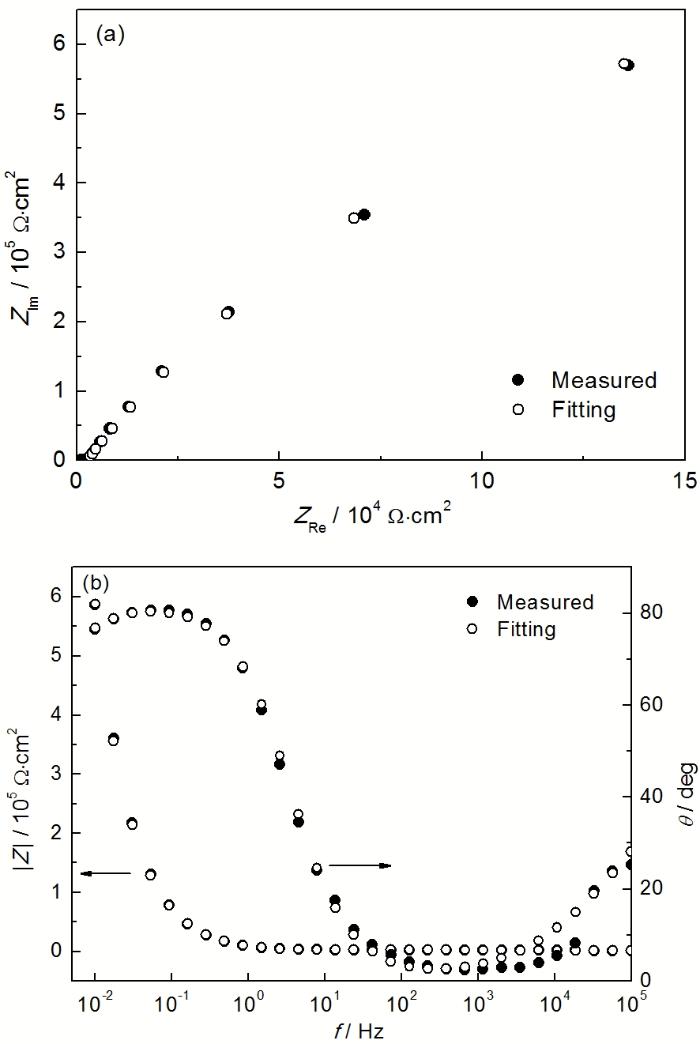 电化学阻抗测试采用三电极体系,参比电极为饱和甘汞电极 (SCE),辅助电极为Pt电极。测试系统由273A电化学工作站与5210锁相放大器组成,测试频率为100 kHz~10 mHz,激励信号为10 mV幅值的正弦波,应用ZSimpWin软件进行数据分析。