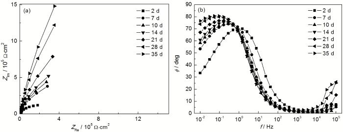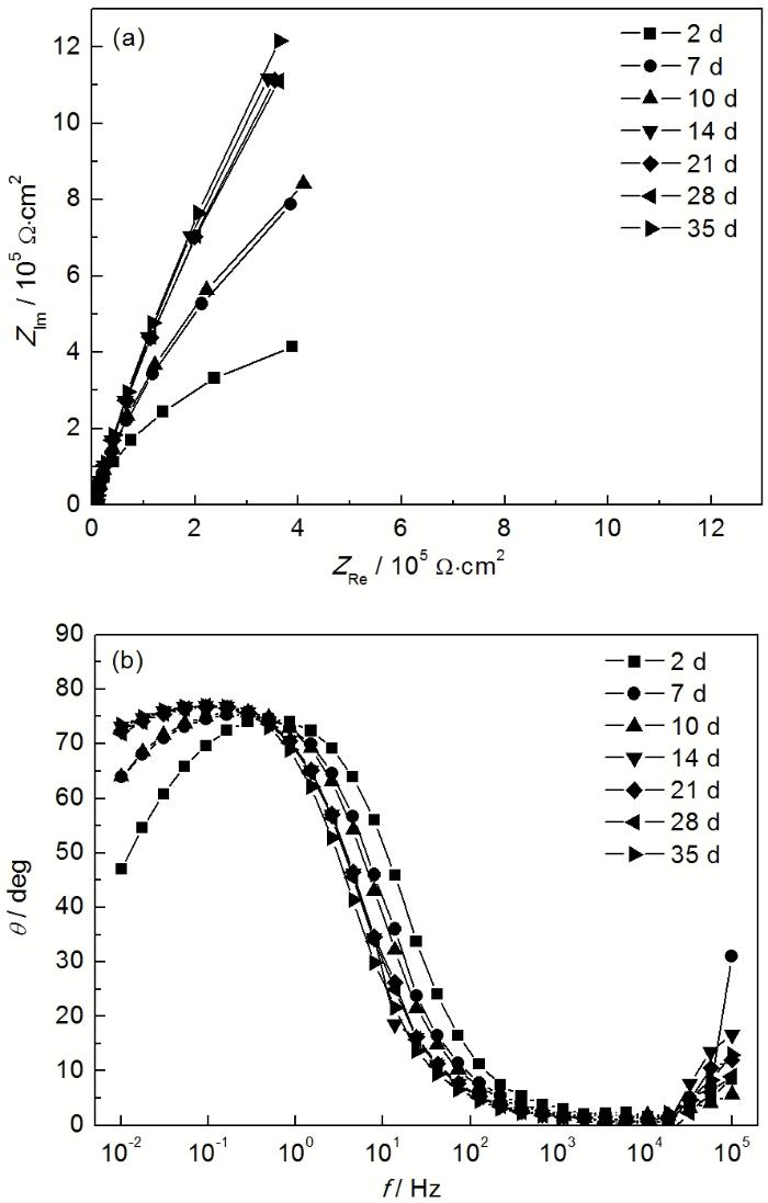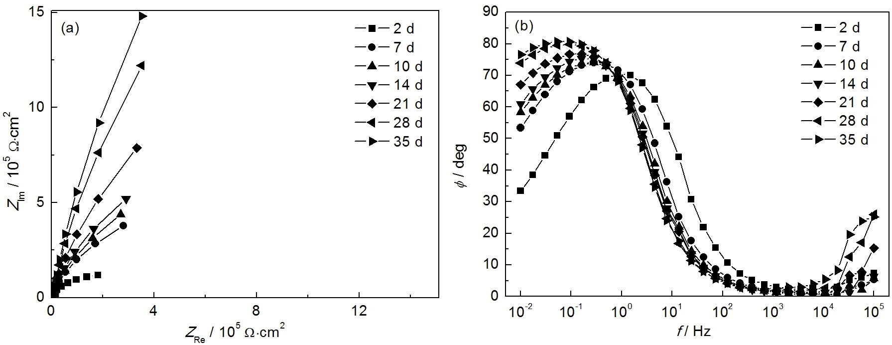Fig.7 Nyquist (a) and phase angle (b) plots of rebar embedded in PMM for different time