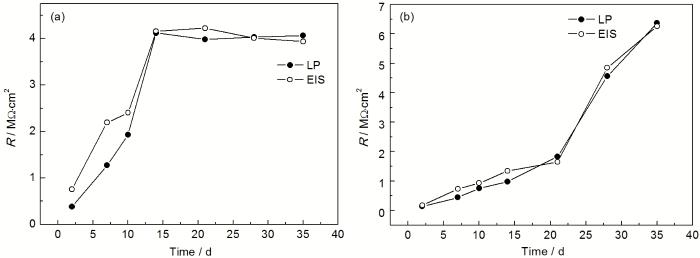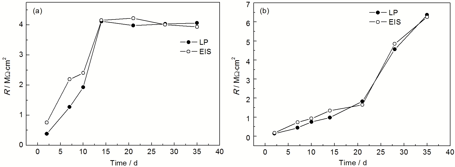 如图9所示,对采用线性极化法与电化学阻抗法两种方法所测得的阻抗进行比较。虽然线性极化法测得的极化电阻Rp为总电阻,即 (Rs+R1+R2),但由电化学阻抗法可以看到,如表2拟合结果所示,(Rs+R1) 值与R2相比近似相差3个数量级,可忽略。因此上述近似合理。从图9可看出,线性极化法测得的极化电阻变化趋势与电化学阻抗法测得的电阻趋势相同,且数值接近。不同的电化学方法给出了相似的结果,验证了当前电化学方法的可靠性和该方法在PMM中的适用性。