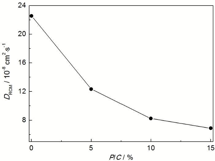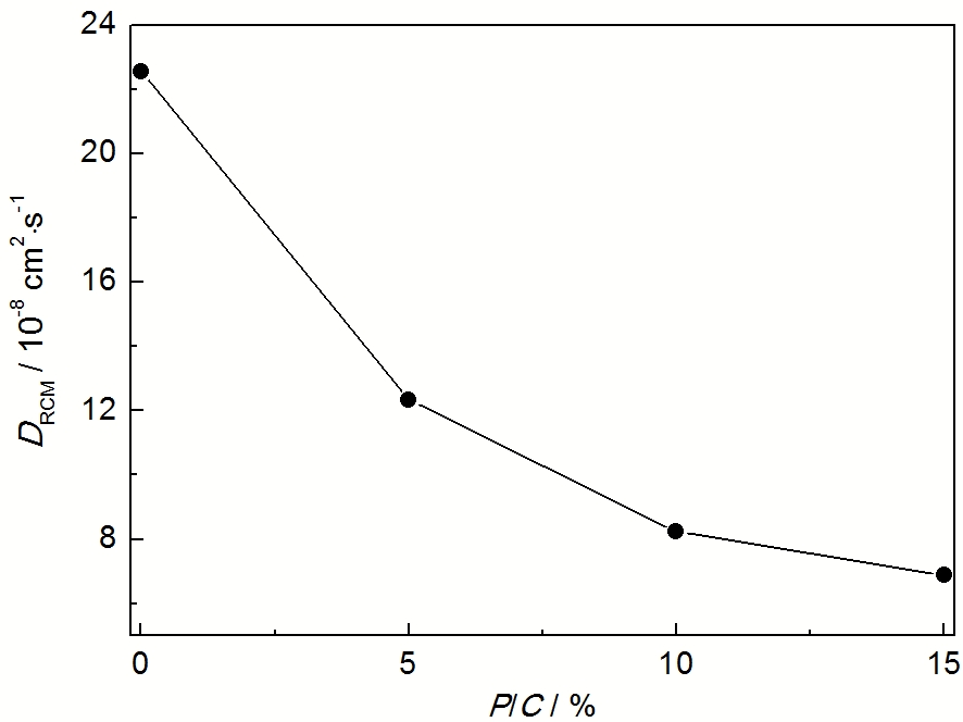 实验采用聚合物质量配比为0%,5%,10%和15%的PMC进行研究。经计算所得的Cl-迁移系数列于图11。从中可见,聚合物的加入显著改变了Cl-在混凝土中的扩散速率。CC的抗Cl-渗透性很差,Cl-迁移系数高达2.25×10-7 cm2/s。随聚合物掺入量的增加,混凝土的孔隙率降低,密实度增加,抗Cl-渗透能力逐渐提升。掺量为5%,10%和15%的PMC的Cl-迁移系数为CC的54.7%,36.5%和30.5%。