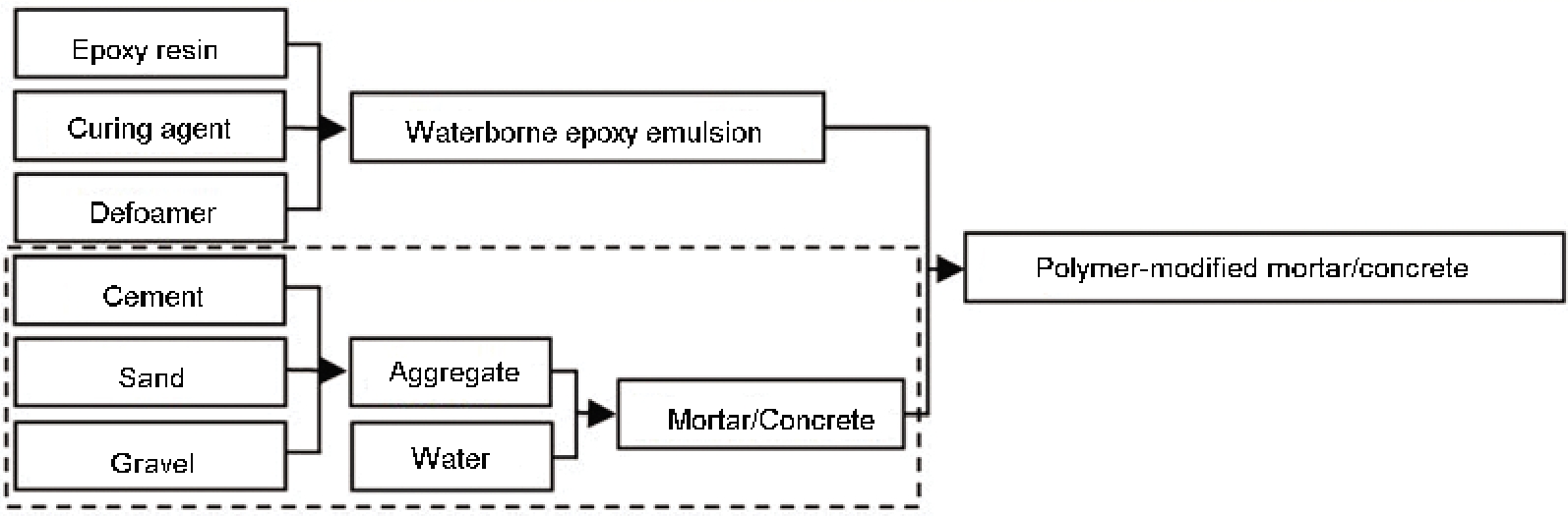 混凝土与水泥砂浆作为一种传统的建筑材料在建筑行业中起着不可替代的作用。通常状态下混凝土可以为钢筋提供高碱性环境使钢筋表面处于钝化状态。但由于混凝土的多孔性结构,其抗渗透性较差,在高腐蚀性环境如海洋环境中,不能对钢筋起到有效的保护作用。研究[1]表明,钢筋的腐蚀是影响钢筋混凝土结构服役寿命的主要因素,由于聚合物改性混凝土 (polymer-modified concrete,PMC) 具有良好的力学性能与耐久性能,近半个世纪来,PMC取得了长足的发展。PMC指在普通水泥混凝土的配方基础上,在搅拌阶段掺入单体或聚合物,成型后经养护形成的一种含有机聚合物的水泥混凝土。PMC的外加剂可分为聚合物颗粒、短纤维和聚合物溶液。相同的改性效果条件下,与聚合物颗粒相比,聚合物溶液的用量较少。短纤维在施工时可直接与粗细骨料预先混合,可降低施工难度且造价较低。无论哪种形式的聚合物外加剂都可起到增强水泥基复合材料各组分结合力的作用,从而提高混凝土的抗压强度、弯曲强度和韧性,所以在修补工程中PMC得到广泛应用。此外,聚合物还可以与水泥的水化产物凝聚交联成网络结构,使混凝土的密实度增加进而提升了混凝土的抗冻性和耐腐蚀性[2]-[5],对钢筋起到更好的保护[6]。