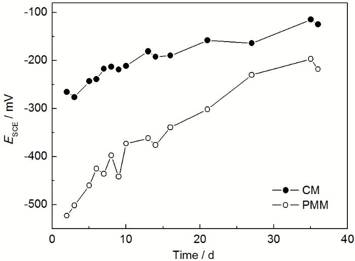 钢筋在CM和PMM中的腐蚀电位随时间演化如图10所示。CM试件中只进行水泥的水化反应,而PMM试件中聚合物乳液的固化反应与水化反应同时进行。通常认为,砂浆中钢筋的腐蚀电位大于-250 mV (vs SCE) 时钢筋处于钝化状态[8],由图10可知CM和PMM中钢筋的腐蚀电位都随时间增大而升高,但PMM中钢筋的起始电位较小,且整个实验周期内,其电位小于CM中的电位值,其值随时间逐渐上升,直到第28 d才升至理论钢筋钝化电位左右,而后电位上升趋势缓慢。相对湿度、水灰比、水泥种类对电位都会产生影响。研究[14]表明,聚合物的加入会对水泥砂浆起减水作用,使砂浆湿度增大;聚合物的加入使砂浆的孔隙率降低,O2更不易到达钢筋表面,钢筋由于贫氧而导致电位下降。从CM和PMM中钢筋的腐蚀电位图也可判断出,由于聚合物的加入使得砂浆的养护期相对延长。