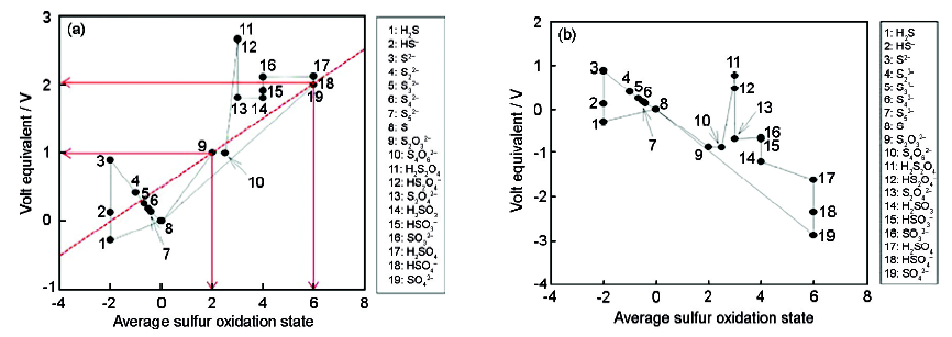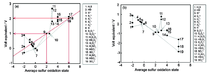 Macdonald和Sharifi-Asl[21]最近提出了一种“Volt等效图”(Volt equivalent diagrams),从电化学热力学上来表示S-H2O体系。图2[21]给出了25 ℃条件下,pH值分别为0和10.5时的Volt等效图。图中任意取3点,如果某一点对应的电位位于其余2点连线的上方,表明该离子倾向于分解为其余2种离子。如图2a中,S2O32-位于S和S4O62-连线的上方,表明在酸性溶液中S2O32-容易分解,分解产物可能有很多种,其中一种反应可能按照下列方式进行: