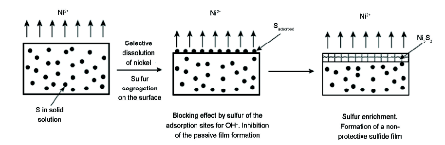 2.6.1 S元素 通常材料本身S含量较高时,随着金属的溶解,材料里面的S会发生偏析吸附在金属表面,加速阳极溶解反应速率。文献[69]报道了当电沉积Ni层里面含有0.012%的S时,Ni层的活化-钝化转变电流比不含S时的大10倍。Duret-Thual等[70]也报道了类似现象。图7[33]给出了示意图,随着金属(比如Ni)的溶解,材料中固溶态的S原子会偏析吸附在表面,阻止OH-的吸附以及钝化膜形成,最终形成硫化物膜。阳极偏析速率取决于材料中S的含量和阳极溶解的速率。阳极溶解的速率往往受晶向的影响,对于单晶来说,溶解速率从小到大依次为(111)<(100)<(110)。